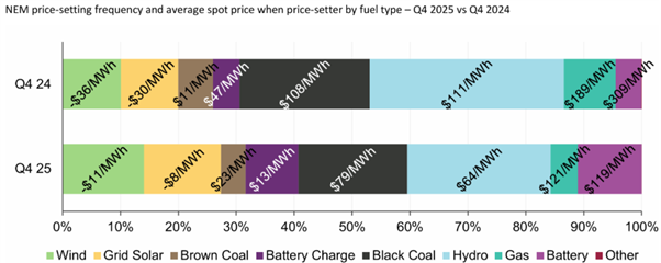 While batteries continue to be the price setter in a relatively small number of periods, their average spot price, like gas, can be high. In Q4 2024 batteries’ involvement in price setting during peak high-priced volatility periods “led to the largest year-on-year growth in average price set for any source, averaging $309/MWh”, according to AEMO.