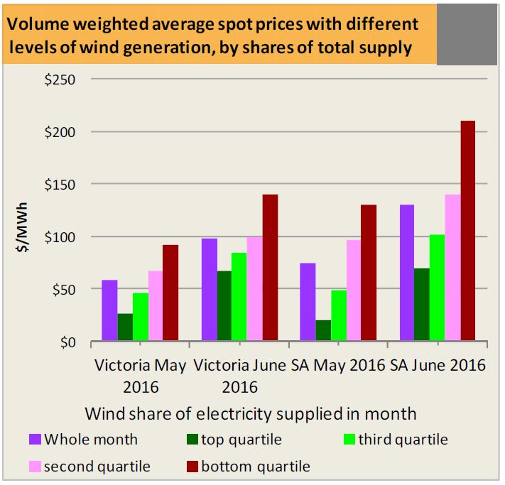 Pitt and Sherry conclude that therefore wind is not the cause of high prices. It is true, indeed unsurprising that wind is not a direct cause – i.e. that high prices do not usually occur when wind generation is running. It is the overall rebalancing of the generation mix that is the underlying cause, with proximate factors such as interconnector outages and high gas prices contributing.