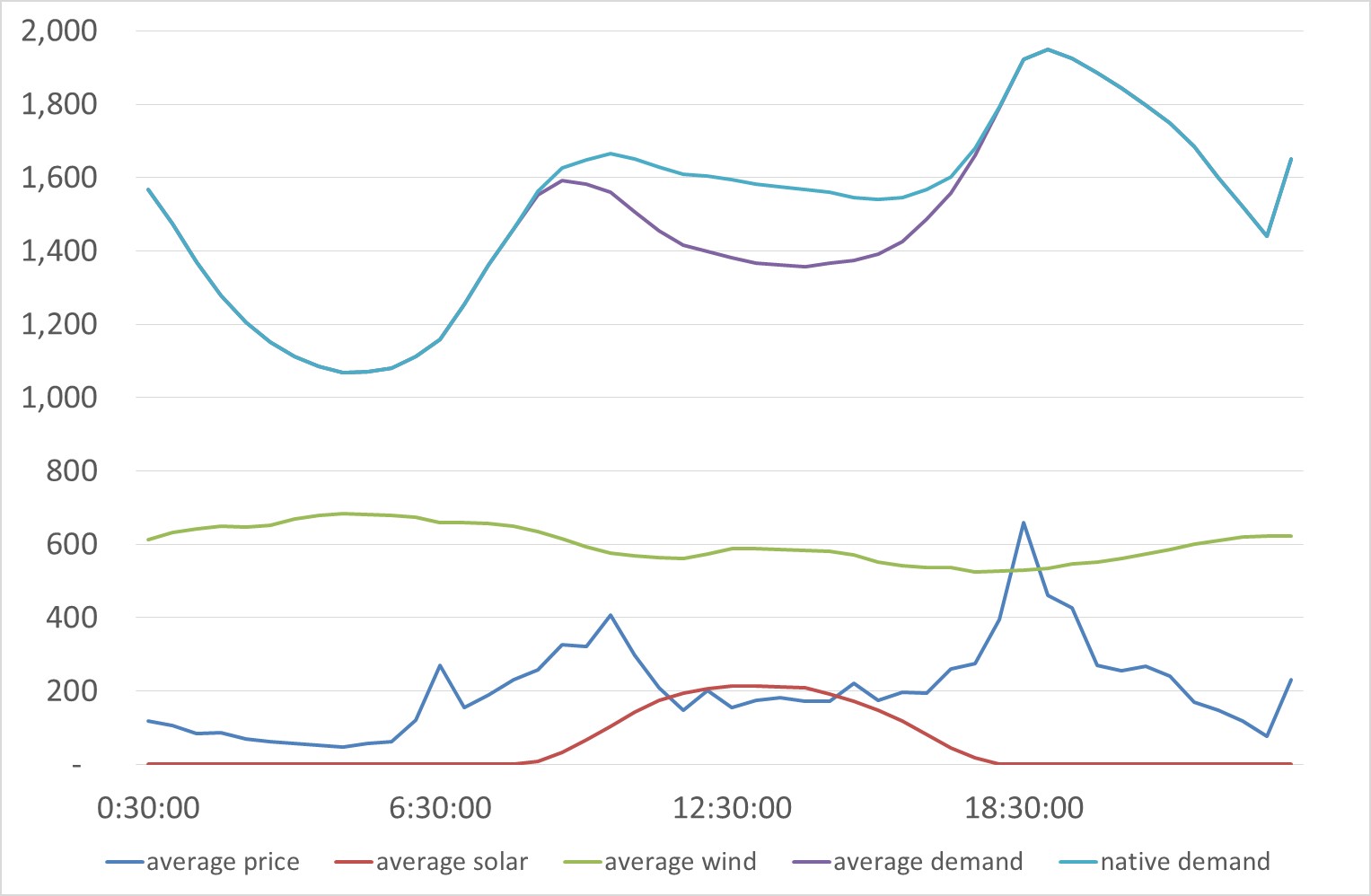 The other key difference is, of course, that intermittent generation is only available to run at certain times, whereas the thermal generation it has displaced is able to run more or less continuously. Logically this means that the rebalancing will lead to more volatility in prices. When the wind/sun are available and able to meet a substantial proportion of overall demand, prices will be low. Conversely, when they are not, and especially if demand is high or the interconnector is unavailable, prices will be higher than before, because there is less dispatchable supply capacity. We have analyzed the prices and supply of renewables by half hour of each day across a recent six week period: