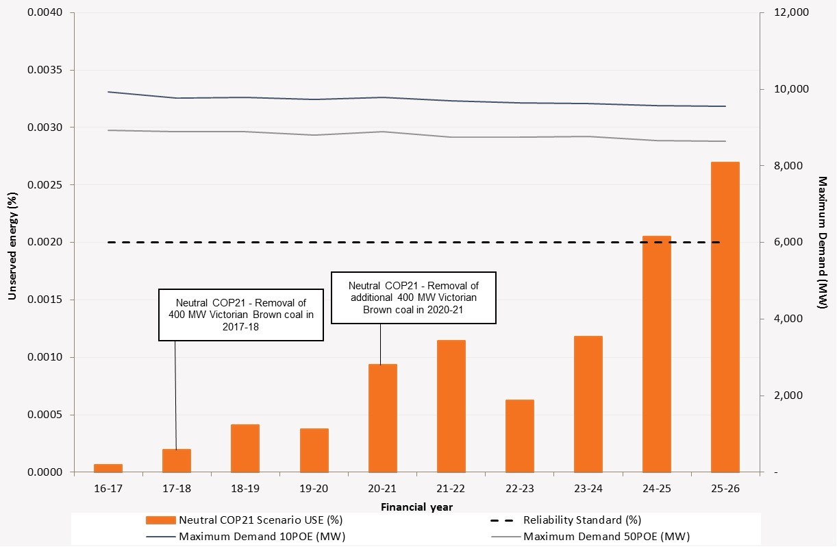 After the exit of Hazelwood, Victoria will source more of its electricity needs from its interconnectors, and generation from black coal, gas and hydro sources[2]. It is important to consider the potential impact of this structural adjustment in energy supply on the reliability and security of power in Victoria. The National Electricity Market (NEM) is designed to provide reliable power and the reliability standard sets an expectation that demand will be met 99.998 per cent of the time in a given year[3]. In September 2016, the Australian Energy Market Operator (AEMO) released estimates of power reliability if 800MW of coal fired generation exited the Victorian market (Hazelwood has 1,600 MW of capacity) under a COP21 scenario. The impact did not present a risk to power reliability in the near term, but the estimates show that in the long term to 2024-25, new investment is required to meet the reliability standard[4].