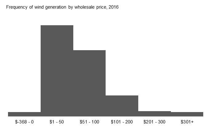 Figure 3: Frequency of wind generation by wholesale spot price - 2016