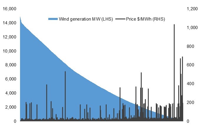 - Prevailing wind resources in a given region can result in wind farms generating on average at the same time and with the same intensity. This results in low wholesale prices at times of high wind generation and high wholesale prices at times of low wind generation.