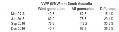 Table 1: Volume weighted price wind generators received in South Australia - 2016