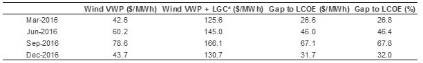 Table 2 presents a scenario in South Australia which assumes that a wind farm requires a minimum $99 MWh in total to be viable (AEMO's LCOE estimate). Based on the VWA price for wind the table shows what would be needed to invest in new wind generation in South Australia. In 2016, the VWA price for all generation in South Australia was around $79 MWh. But the VWA price for wind generation in South Australia was $57 MWh, substantially less than the price needed by a new wind developer to invest.