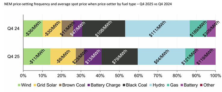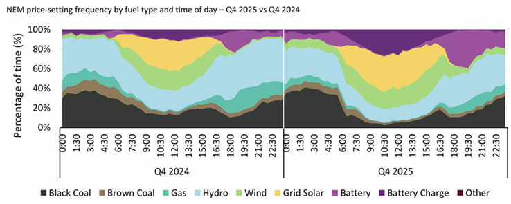 But batteries will also reduce the amount of gas back up needed. AEMO’s Quarterly Energy Dynamics (QED) reports are showing that batteries are increasingly involved in price setting in the wholesale market in high price periods, traditionally the role played by peaking gas generators. For example. the QED for the fourth quarter last year showed growth in the price setting role of batteries (see figures 2 and 3).